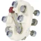 Disque en polyuréthane moulé absorbant les chocs, vibrations, bruits, poussées de ligne d'arbre et désalignements temporaires. Isole électriquement la ligne d'arbre. Ni usure, ni entretien. Fourni avec visserie complète.
