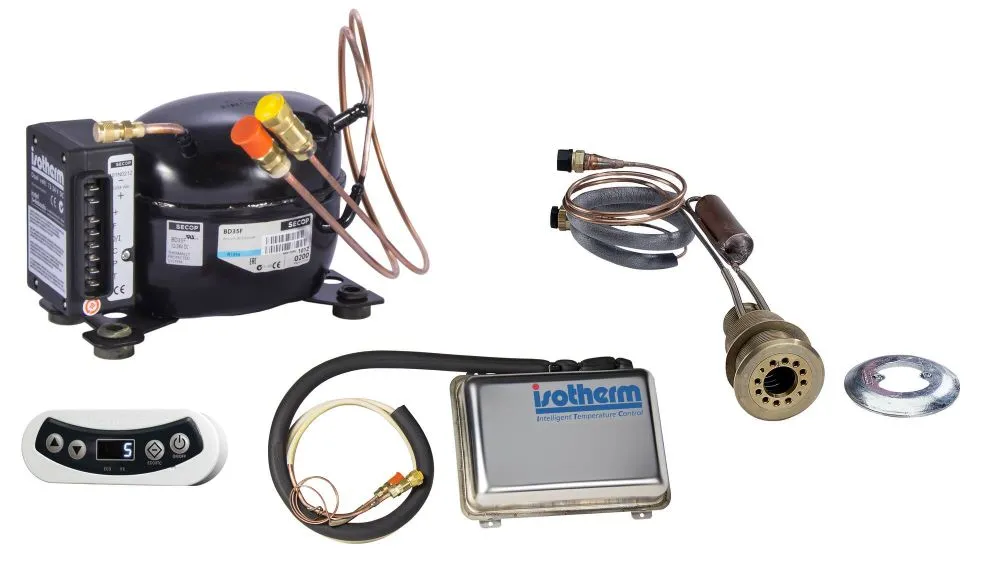 Long. tuyauterie : groupes à air et eau par pompe : 3m. Groupes à eau SP : compresseur passe-coque, 1,5m et passe-coque évaporateur, 3m.