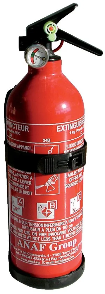Modèle à pression permanente (avec manomètre et support), à poudre ABC (tout type de feux sauf feux de métaux), avec robinetterie plastique, dispositif de sécurité plombé, réservoir aluminium.