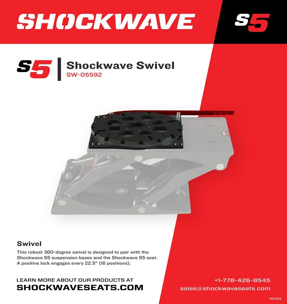 Cette base pivotante 360 degrés est conçu pour s'associer aux bases de suspension S5 et au siège Shockwave S5 Corbin. Un verrouillage positif s'enclenche tous les 22,5° (16 positions).