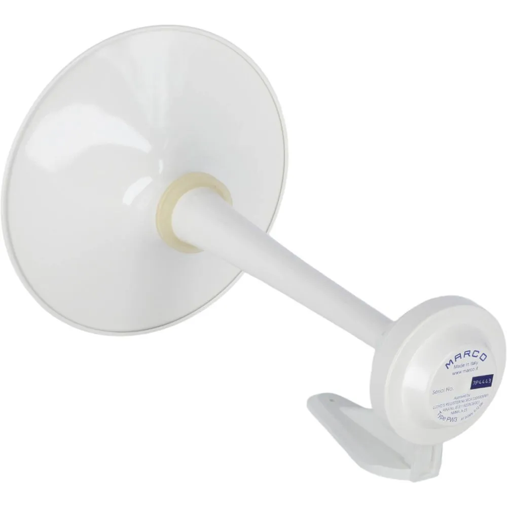 RINA ELE/35398/1 et LLOYD’S MSA9800032. Pavillon Ø300mm laiton peint vernissé blanc. Branchement sur air du bord 6 à 12 bars nécessaires. Livré avec accessoires et électrovanne. Trompe seule K344.